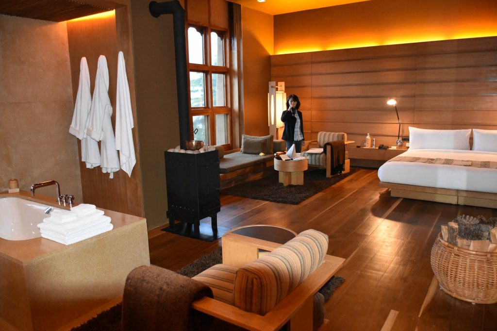 Gangtey Lodge rests gently above the valley floor, where endangered black-necked cranes glide across fields, and prayer flags dance with the wind. Each of the eight suites measures 52 square metres and features floor-to-ceiling valley views, polished wood floors, warm timber walls, and terrazzo soaking tubs.