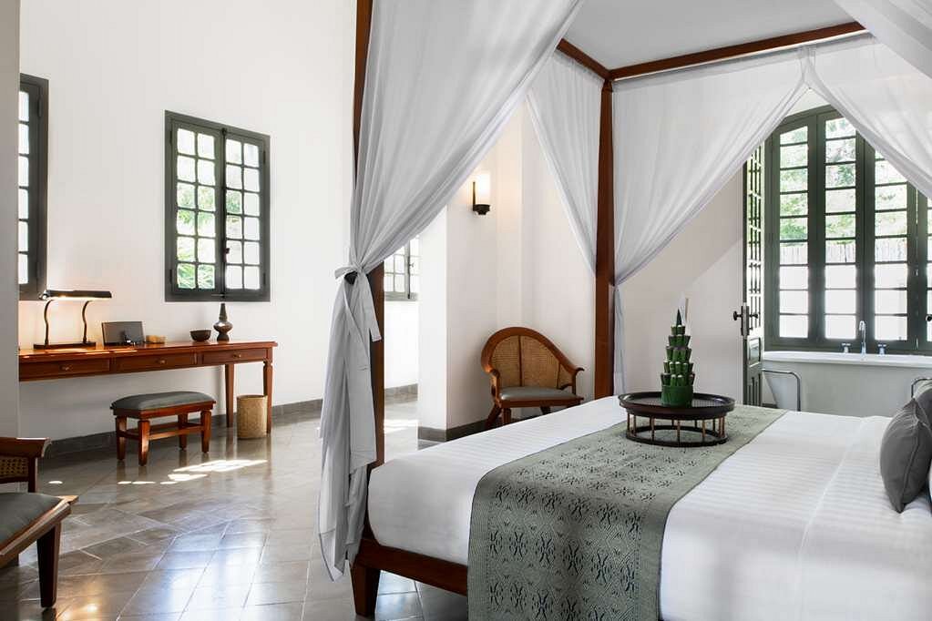 Once a provincial hospital in the French Indochina era, Amantaka now houses 24 suites, each a blend of colonial architecture and Laotian elegance. Expect lofty wooden ceilings, four-poster beds, and shuttered windows that open onto private courtyards or serene verandas. Some suites come with cooling plunge pools, ideal for midday repose after morning temple visits.